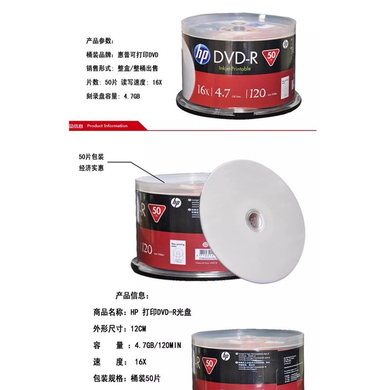惠普HP DVD-R 光盤/刻錄盤空白光盤16速4.7G 50片
